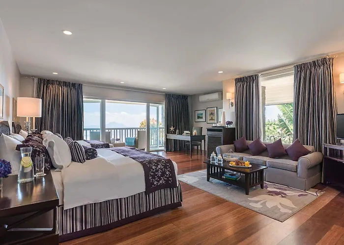 They are furnished with dark furniture including a sofa and a writing desk. The private bathrooms have a spa bathtub and a hot tub.